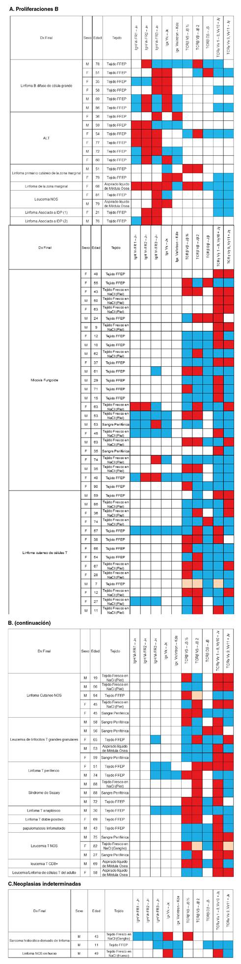 En un linfoma de la zona marginal y en uno cutáneo de la zona marginal, se analizaron los reordenamientos de TCRβ Vβ - Jβ ½ & 2, los cuales fueron clónales. El linfoma de la zona marginal, la leucemia B NOS y los linfomas asociados con alguna inmunodeficiencia primaria, mostraron reordenamientos, por lo menos, en una región de IgH.