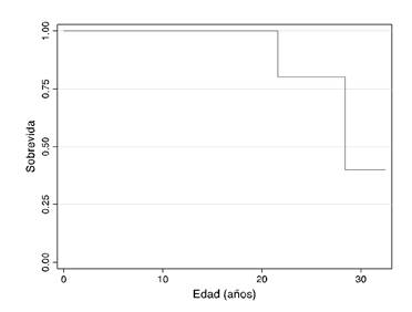 En el cuadro 2 se resumen las manifestaciones clínicas. En el momentode la evaluación, un paciente con atrofia muscular espinal de tipo I presentaba debilidad muscular, hipotonía, disminución de reflejos tendinosos, retraso en el desarrollo, contracturas musculares y disnea. Todos los pacientes con la de tipo II presentaban escoliosis, 9/10 tenían debilidad muscular, hipotonía y disminución de reflejos tendinosos; 8/10 presentaban atrofia muscular, 7/10 retraso en el desarrollo motor, y 5/10, contracturas musculares. Todos aquellos con la de tipo III presentaban hipotonía, debilidad muscular, disminución de reflejos tendinosos, atrofia muscular y displasia de cadera, y 2/3 de este grupo presentaba escoliosis. En la muestra analizada, había un paciente de 5 años con atrofia muscular espinal de tipo I que presentaba gastrostomía y traqueotomía, y requería asistencia respiratoria mecánica permanente. Dos pacientes, uno con la de tipo II y otro con la de tipo III, fallecieron por causas relacionadas con la enfermedad. Se analizó la curva de supervivencia y se estimó una supervivencia de 28,6 años (IC95% 24,8-32,5) (figura 1).