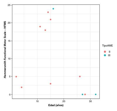 El puntaje funcional en el paciente de la cohorte con atrofia muscular espinal de tipo I, fue de 3 a la edad del análisis (5 años). En 5 de los 9 casos de la de tipo II, se obtuvieron puntajes en la escala de Hammersmith que oscilaron entre 0 y 5; 4 de ellos obtuvieron valores mayores, cercanos a los puntajes funcionales de aquellos con la de tipo III (entre 18 y 20). Dos de los pacientes con atrofia de tipo III obtuvieron un puntaje de 0. Se encontró una correlación entre la edad en el momento de la evaluación y el puntaje funcional en la escala de Hammersmith (figura 2).