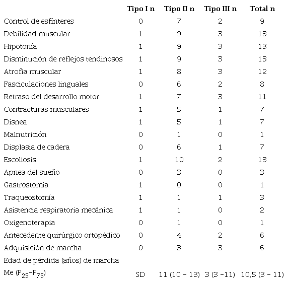 La mediana de edad al inicio de los síntomas de las atrofias de tipos I, II y III fue de 1, 9 y 30 meses, respectivamente, y en el momento de su diagnóstico, de 11, 36 y 48 meses, respectivamente.