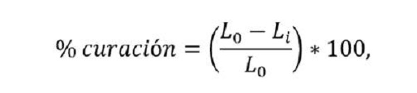Para el porcentaje de curación, se usó la fórmula adaptada para la medición de longitud (mm) presentada en el estudio de Jessup 24.