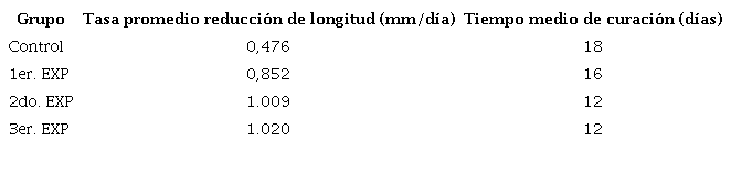 Para observar el efecto de los tratamientos sobre la longitud de la herida, se calculó la tasa de reducción de la longitud (cuadro 2). Se registró, además, el tiempo promedio de curación de cada grupo a partir del día en que se hizo la herida hasta su cicatrización completa, en cada individuo dentro de cada grupo. En el segundo y el tercer grupo (tratados con membrana de huevo), la tasa de reducción de la longitud fue mayor que en el grupo que no recibió tratamiento y que en el primer grupo (tratamiento convencional con agua oxigenada) El tiempo de curación fue mayor en el grupo control y el primer grupo, en tanto que, en los grupos tratados con membranas de huevo, este fue menor.