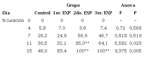 Se utilizaron un análisis de varianza (ANOVA) y el test de Dunnett para comparar cada grupo experimental con el grupo control 25. Con el ANOVA se determinó si existía una diferencia significativa entre los porcentajes de curación de todos los grupos de estudio, incluido el grupo control. El análisis se hizo en los días 4, 7, 11 y 15. Si el valor de significación era mayor de 0,05, no se hacía el test de Dunnett, pues ello significaba que la media de los porcentajes de curación de todos los grupos no presentaba una diferencia significativa. Si el valor de significación resultaba menor o igual a 0,05, entonces se hacía el test de Dunnett para evaluar cuál de los tratamientos presentaba una diferencia significativa con respecto al grupo de control.