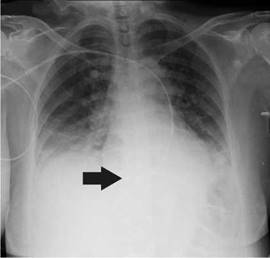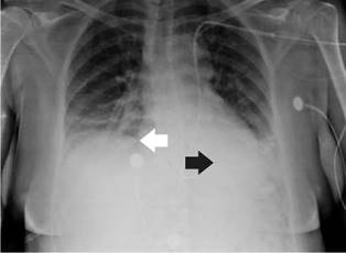 She was diagnosed with cardiogenic shock secondary to non-ST elevation acute myocardial infarction and sinus bradycardia. The initial management in the emergency room, therefore, included dual antiplatelet therapy, anticoagulation, norepinephrine, and dopamine. Then, the patient was transferred to the intensive care unit where a transvenous pacemaker was implanted using the right subclavian anatomical approach with adequate return and no suitable capture. A control chest radiography was performed which revealed no pneumothorax and hemothorax but evidenced the extreme of the pacemaker on the left atrium (figure 1). The pacemaker was considered to be poorly located, so a new one was placed through the left subclavian anatomical approach without complications and adequate capture. However, the team suspected a vascular malformation in the control chest radiograph because the extreme part of the pacemaker was located on the right ventricle (figure 2).