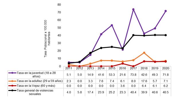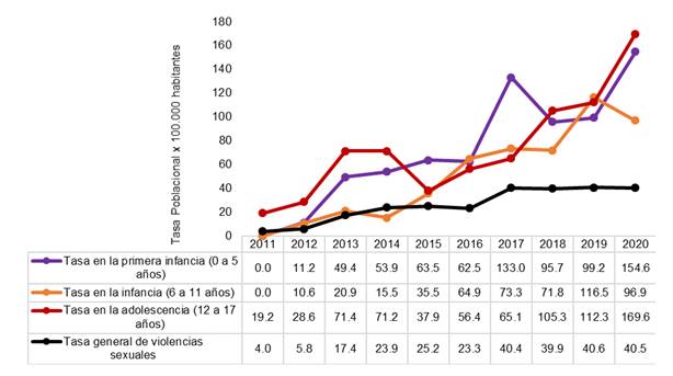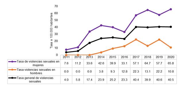 Conclusión. : La violencia sexual es un problema en aumento; en el 2020, año del confinamiento poblacional por la Covid-19, las tasas en mujeres y durante la primera infancia, la adolescencia y la juventud, fueron las más altas del periodo de estudio.