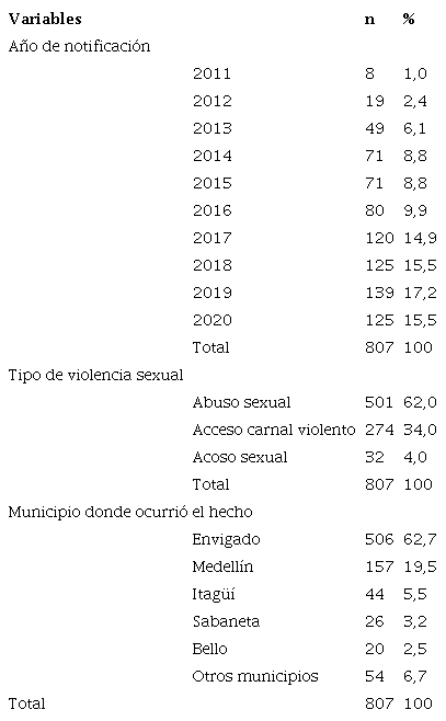 Materials and methods: This was a descriptive cross-sectional study that analyzed all the sexual violence records reported in the Envigado Public Health Surveillance System for gender and intrafamilial violence (file code INS-875) during the 2011-2020 period.