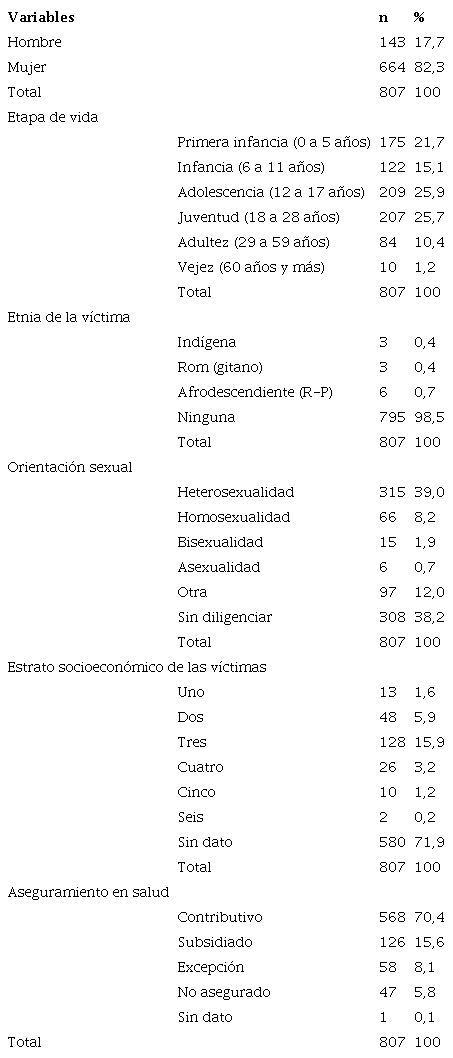En el cuadro 2 se presentan las características sociodemográficas de la población de estudio. El 82,3 % (664) de los casos correspondió a mujeres, y de estos, siete fueron contra personas con algún tipo de discapacidad y edades entre los 8 y los 73 años, en tanto que, en cuatro casos, las víctimas tenían algún tipo de diagnóstico de carácter psiquiátrico. Además, el 80,3 % (533) de los casos se presentó contra mujeres en edad reproductiva (entre los 10 y los 49 años), de las cuales, el 5,8 % 31 estaba en gestación (entre la semana 5 y la 40) en el momento del evento.