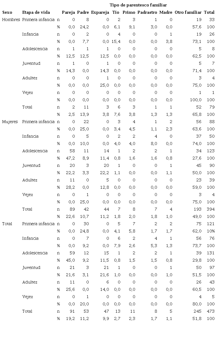 En cuanto al parentesco entre agresor y víctima, en el 58,6 % (473) de los casos existía algún tipo de parentesco familiar. En el cuadro 3 se evidencia que, de los casos con algún parentesco, la pareja (19,2 %) o expareja (9,9 %) fue la agresora, con el 29,1 % de los casos. El padre fue el agresor en el 11,2 % de los casos y, otros familiares, en el 48,0 %. Cabe señalar que la ficha de notificación no permite la identificación específica de los otros tipos de familiares. Además, en el cuadro se aprecia que, según el sexo y el curso de vida de las víctimas, un mayor porcentaje de hombres sufre violencia sexual por parte de sus padres, especialmente durante la primera infancia (24,2 %), y por parte de los tíos, durante la infancia (15,4 %). En la adolescencia y la juventud, el principal agresor(a) fue la pareja o expareja.