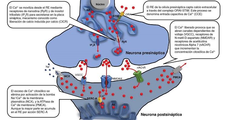 Este incremento súbito es necesario para la sincronización en la liberación de neurotransmisores a la hendidura presináptica. Después, para recuperar el potencial de reposo, es necesario reducir el nivel de Ca2+ citosólico de nuevo, para lo cual se requiere la acción de bombas de Ca2+ como la bomba Na+/Ca2+ de la membrana plasmática (NCX) y la ATPasa de C2+ de la membrana plasmática (PMCA). Además, es posible secuestrar el exceso del ion en la luz del retículo endoplásmico mediante bombas que utilizan ATP para capturar el Ca2+ en estos depósitos intracelulares hasta alcanzar el potencial previo a la liberación (figura 1) 16,17.