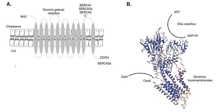 La proteína está constituida por unos 1.000 aminoácidos con un peso molecular de 110 kDa. Presenta los extremos N-terminal y C-terminal hacia el citoplasma (SERC-A1,2a y 3); ocasionalmente, el C-terminal se orienta hacia la luz (SERC-A2b), tiene 10 (SERC-A1,2a y 3) a 11 (SERC-A 2b) dominios transmembranales. Estos dominios transmembranales que también conforman el canal de calcio, presentan una cabeza globular constituida por dos dominios citoplasmáticos, uno de los cuales es el dominio catalítico, donde se encuentra un residuo de ácido aspártico que se fosforila durante la activación y el sitio de unión del ATP (figura 2) 26-28.
