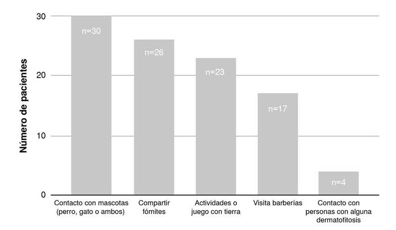 Algunos de los factores de riesgo más frecuentes en la población estudiada fueron el contacto con mascotas -perro, gato o ambos- (30 %), el contacto con fómites (26 %) y las actividades o juegos con tierra (23 %). La alta frecuencia de contacto con mascotas como factor de riesgo contrasta con lo encontrado en un estudio en Camerún, en población infantil con tinea capitis, en el cual la presencia de animales no mostró tener una relevancia estadística en el desarrollo de esta infección 18. Por el contrario, la baja frecuencia de contacto con personas afectadas por dermatofitosis se diferencia de lo encontrado en estudiantes de área rural de Eskisehir (Turquía) donde se evidenció que la presencia de dermatofitosis en la familia era un factor de riesgo para el desarrollo de esta en los estudiantes 19, hallazgo también descrito en el estudio realizado en Bélgica 15.