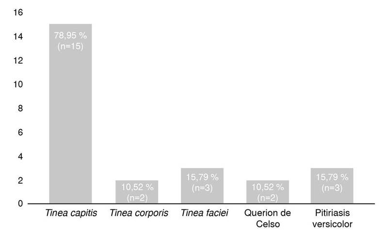 De las presentaciones clínicas encontradas en los pacientes con diagnóstico de micosis confirmado, la tinea capitis fue la más común en el 78,95 % (n=15) de los casos, dos pacientes presentaron querion de Celso (10,52 %), tres presentaron tinea faciei (15,79 %) y dos tenían tinea corporis (10,52 %). En dos (10,52 %) pacientes se confirmó el diagnóstico de pitiriasis versicolor (figura 2).