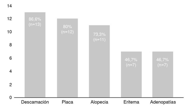 En el examen físico se hallaron adenomegalias en el 35,9 % (n=14) de los pacientes, localizadas principalmente en la región cervical. Las características más comunes de las lesiones, en las diferentes formas clínicas, fueron descamación y eritema. En la figura 3 se presentan las características de las lesiones en los pacientes con diagnóstico confirmado de tinea capitis.