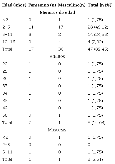 Los rangos de edad en los 47 menores de edad evaluados oscilaron entre los 7 meses y los 16 años, con una media de edad de 6 años y una proporción entre hombres y mujeres de 2:1 (cuadro 1).
