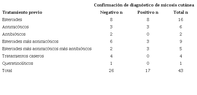Cuando se les preguntó a los pacientes por tratamientos previos durante la evolución de la enfermedad, el 75,43 % (n=43) manifestó haber usado algún tratamiento previo a la evaluación clínica y a la toma de la muestra (cuadro 2). El uso de esteroides fue el tratamiento más frecuentemente usado por el 69,76 % (n=30) de los pacientes: solos en el 37,2 % (n=16) o en combinación con antimicóticos y antibióticos en el 32,55 % (n=14) (cuadro 3). De los pacientes con diagnóstico confirmado, el 94,73 % (n=18) refirió tratamiento previo con antimicóticos, mientras que el 77,77 % (n=14) se había tratado previamente con esteroides solos o en combinación. En cuanto al uso de antimicóticos, la mayoría de los pacientes reportó su uso tópico: solo en el 13,95 % (n=6) o en combinación con esteroides y/antibióticos en el 32,55 % (n=14).