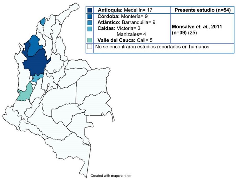 Únicamente el estudio de Monsalve et al. (2011) muestreó humanos y encontró una seroprevalencia del 78 % en 39 trabajadores de zoológicos, expuestos a aves, provenientes de los departamentos de Córdoba, Atlántico, Caldas y Valle del Cauca (cuadro 5; figura 1). En los cuatro estudios encontrados, se reportó la presencia directa o indirecta de la bacteria en aves. En dos de ellos se encontraron prevalencias entre el 79 y el 90 % 25,29; en uno se indicó una prevalencia del 25,4 % 28 y en el último solo se detectó un ave positiva de las seis estudiadas 27 (cuadro 5).