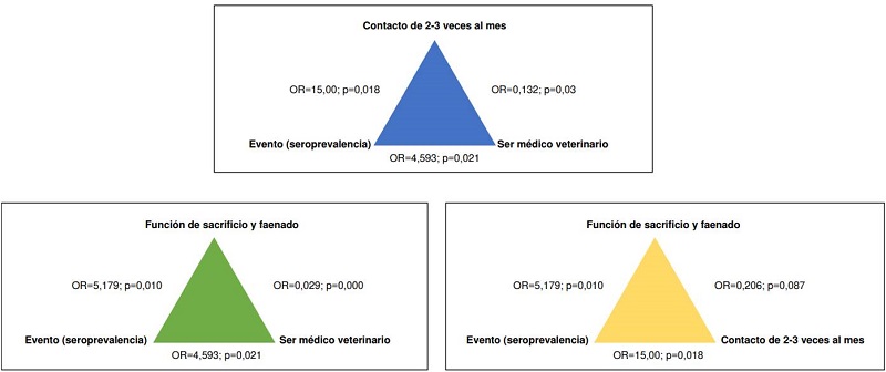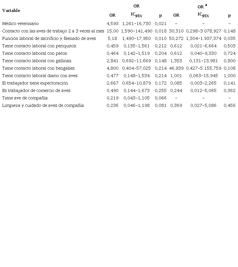 El análisis multivariado indicó que realizar la función de sacrificio y faenado de las aves sin ser médico veterinario es un factor de riesgo asociado con la presencia de anticuerpos contra C. psittaci en los trabajadores expuestos a aves (razón de probabilidad = 50; IC95% = 1,3041937,374; p=0,035). Estos hallazgos demuestran la potencial exposición a C. psittaci en el entorno laboral de la población estudiada (cuadro 4).