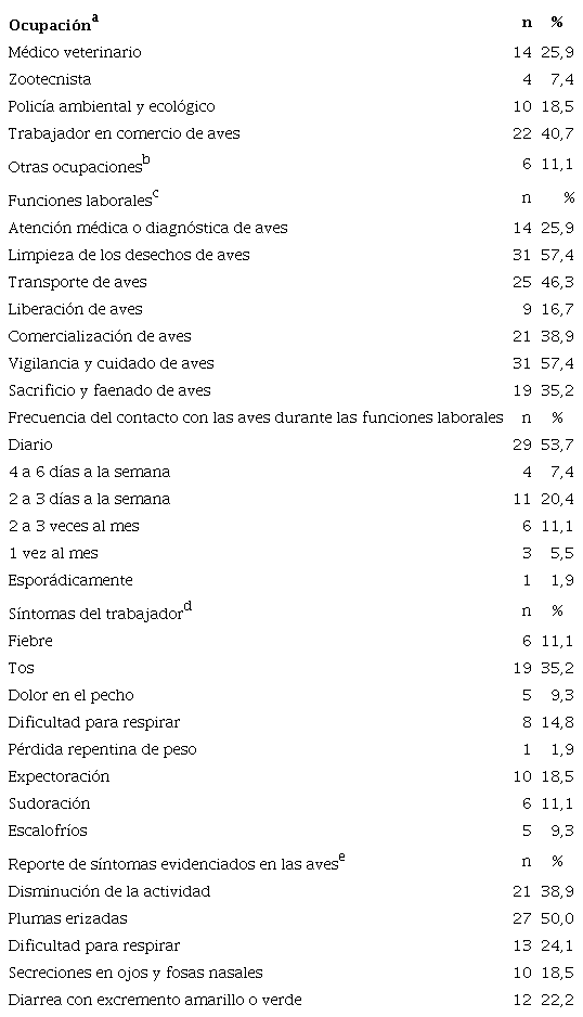 Para tener un panorama de la exposición a aves durante el trabajo, se indagó a los participantes por los cargos que desempeñaban, sus funciones y la frecuencia del contacto con las aves. Asimismo, si habían presentado sintomatología respiratoria indicativa de psitacosis en las dos últimas semanas previas a la inclusión en el estudio. El 40,7 % (n=22) era comerciante de aves; el 25,9 % (n=14), médicos veterinarios, y el 18,5 % (n=10), policías ambientales y ecológicos. El porcentaje restante desempeñaba otras ocupaciones en las que ocasionalmente manipulaban aves, como labores administrativas, educación ambiental, coordinación de equipos de trabajo y labores exclusivas de transporte (cuadro 1).