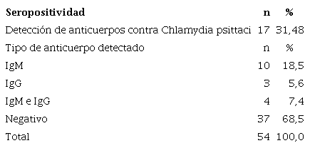 Se encontró una seropositividad para C. psittaci del 31,5 % en los trabajadores expuestos a aves incluidos en el estudio (n=17), en los que se detectaron anticuerpos tipo IgG, IgM o ambos (cuadro 2). De los siete individuos que presentaron anticuerpos IgG, cuatro tuvieron títulos positivos hasta 1:64, y tres, de 1:128. Los 14 trabajadores en los que se detectó IgM tuvieron títulos positivos de dilución 1:2.