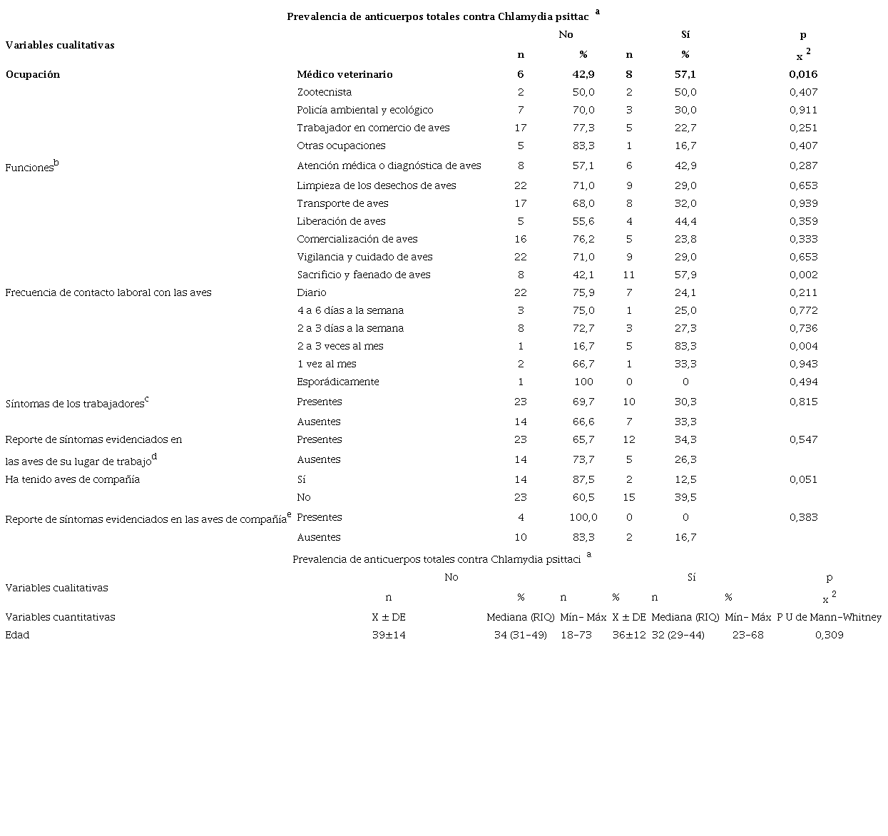 Materiales y métodos: Se llevó a cabo un estudio descriptivo, transversal, con intención analítica, en trabajadores en contacto con aves y se revisó la literatura científica relacionada en Colombia. Se detectaron anticuerpos IgM e IgG contra C. psittaci en suero por microinmunofluorescencia. La descripción de las características sociodemográficas y de exposición se hizo con frecuencias y medidas de resumen. Se exploraron factores asociados por análisis bivariados y multivariados. La revisión de la literatura científica y gris se hizo con búsqueda estructurada.