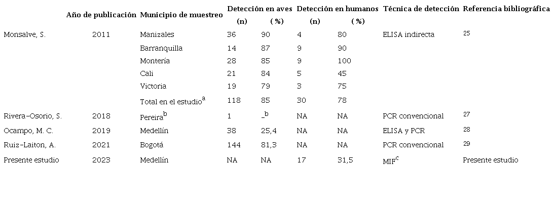 En la revisión bibliográfica, solo se encontraron cuatro estudios sobre C. psittaci en Colombia (cuadro 5) 25,27-29.