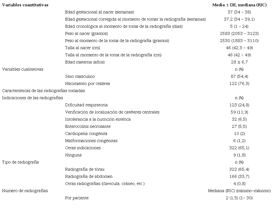 En el estudio se incluyeron 160 pacientes entre abril y septiembre de 2021. En el cuadro 1, se describen las características generales de los neonatos que requirieron al menos una radiografía durante su estancia en la Unidad de Recién Nacidos del Hospital Universitario San Ignacio.