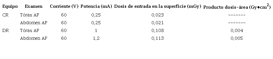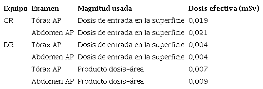 La dosis efectiva que reciben los pacientes por una radiografía de tórax es 4,75 veces mayor con el equipo computarizado que con el digital y, asimismo, por una radiografía de abdomen, es 5,25 veces mayor. Con el equipo digital, las dosis efectivas obtenidas con base en el producto dosis-área, son mayores a las obtenidas con la dosis de entrada en la superficie. Esto implicaría que calcular las dosis efectivas con base en la dosis de entrada en la superficie, hace subestimarlas con un factor de 2.