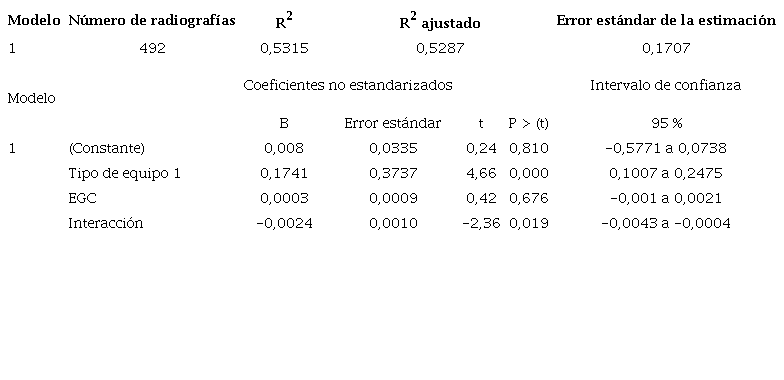 Se realizó un análisis multivariado con regresión lineal múltiple. La variable dependiente fue la dosis de entrada generada por cada radiografía, y las variables independientes fueron edad cronológica, edad corregida al momento de la toma de la radiografía, sexo, peso al nacer, talla al nacer y tipo de equipo. Con este análisis, se pudo identificar que la toma de una radiografía con el equipo computarizado aumenta la dosis de entrada en la superficie en 0,174 mGy. Además, se puede considerar que la dosis depende más de la madurez del neonato, ejemplificada por la edad gestacional corregida al momento del estudio, que por otros factores adicionales. Este modelo fue el más parsimonioso y explicó la dosis de entrada en la superficie en un 53 %.