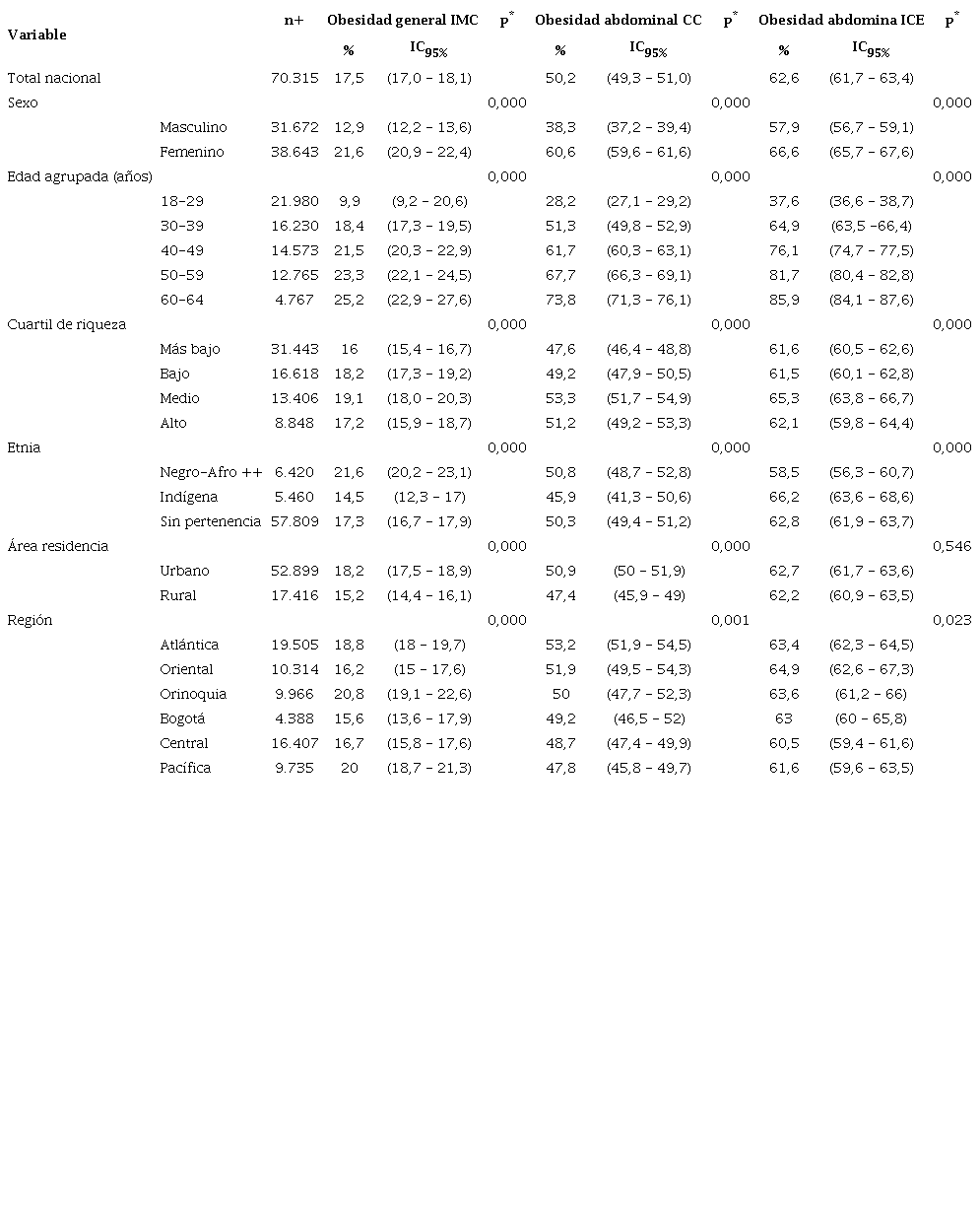 Al diferenciar según el tipo de obesidad, además de las prevalencias más grandes mencionadas, se destacan: en la general (IMC), la obesidad en los afrodescendientes (21,6 %) y en la región de la Orinoquía y la Amazonía (20,8 %); en la obesidad abdominal según la circunferencia de la cintura, también resaltan la prevalencia según la etnia en los afrodescendientes (50,8 %) y en la región Atlántica (53,2 %); en la obesidad abdominal según el índice cintura- estatura, la etnia indígena (66,2 %) y la región Oriental (64,9 %) presentaron las mayores proporciones (cuadro 3).