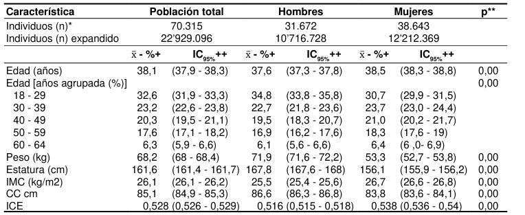 Materials and methods: . Secondary analysis of the ENSIN survey for Colombia with data collected between 2015 and 2016, the 2005 Population and Housing Census of the Departamento Administrativo Nacional de Estadística (DANE) was used as a sampling frame. The sample was 44,202 households with 151,343 people aged 0 to 64 years; 70,315 records of adult population were selected for this analysis. Proportions, confidence intervals, measures of central tendency and dispersion were calculated.