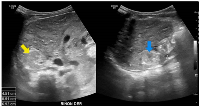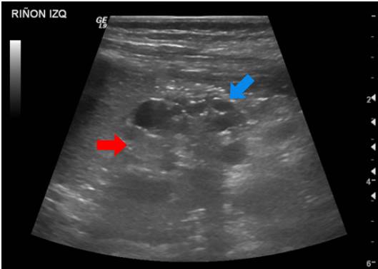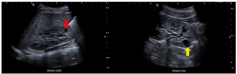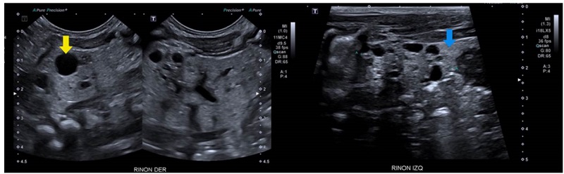 Se trató de un paciente de sexo masculino que a los dos años de vida presentó un cuadro clínico de lesión renal aguda KDIGO 3 en el contexto de una infección gastrointestinal 9. Se practicó una ecografía renal que evidenció la dilatación de las vías urinarias del lado derecho, por obstrucción secundaria a estenosis de la unión pieloureteral, con un riñón izquierdo de apariencia displásica multiquística (figura 1).