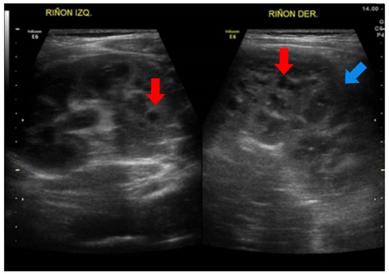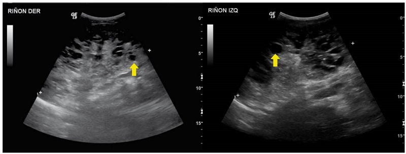 Se trató de una paciente de sexo femenino, producto de una unión no consanguínea, sin antecedentes familiares de relevancia, con hallazgos prenatales de oligohidramnios, agenesia renal derecha y displasia renal izquierda. La ecografía renal posnatal evidenció aumento de la ecogenicidad renal con quistes corticales periféricos milimétricos, lo cual sugirió el diagnóstico de enfermedad poliquística renal autosómica recesiva (figura 2). La secuenciación del exoma clínico reveló la presencia de una variante patogénica de novo en el gen PAX2, previamente reportada 11.