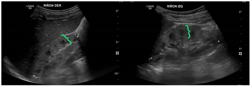 Se trató de una paciente de sexo femenino, producto de la primera gestación de la madre de 16 años, que asistió a tres controles prenatales durante todo el embarazo. La paciente nació a las 26 semanas de gestación por ruptura prematura de membranas y sospecha de corioamnionitis. Tuvo múltiples complicaciones asociadas con la prematuridad, como hemorragia intraventricular, conducto arterioso persistente, displasia broncopulmonar, síndrome convulsivo, resección intestinal por enterocolitis necrosante y falla intestinal secundaria; también, presentó deficiencia de vitamina D, múltiples fracturas e hipocalcemia grave. La ecografía renal mostró aumento de la ecogenicidad cortical renal y múltiples quistes corticales, bilaterales y menores de 5 mm (figura 9). Durante el seguimiento, la paciente tenía presión arterial normal y diuresis adecuada, función renal normal, sin acidosis metabólica ni alteraciones electrolíticas.
