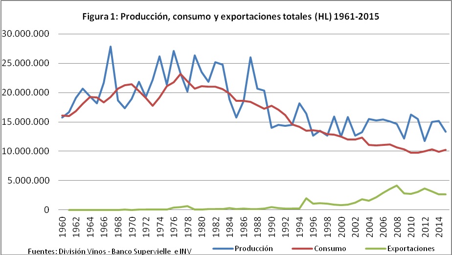 Argentina ha sido históricamente uno de los principales productores mundiales de vino y es actualmente el quinto, detrás de Francia, Italia, España y Estados Unidos (OIV, 2016). Mientras que también ha sido tradicionalmente un país con altos niveles de consumo, las últimas tres décadas han atestiguado un descenso significativo. Esto ha resultado en un importante incremento en la brecha entre producción y consumo (de un 11 % en el período 1986-1990 a un 37 % en 2011), lo que llevó a la Organización Internacional de la Viña y el Vino (OIV, por sus iniciales en francés) a cambiar la clasificación de Argentina de país consumidor a exportador neto (OIV, 2009). La Figura 1 muestra como desde 1977 la evolución de la demanda ha sido negativa, lo que arrastró hacia abajo también los niveles de producción.