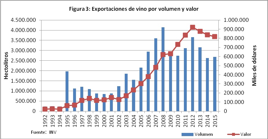Esto fue acompañado por un cambio paradigmático del sector, que comenzó a producir vinos finos para el mercado internacional. Mientras que, como se puede apreciar en la Figura 1, las exportaciones habían sido insignificantes antes de 1995, ahora se han convertido en una alternativa fundamental ante el menguante consumo local. Esta transformación ha dividido al régimen de acumulación de la industria en dos: un sector reconvertido, creciente y en expansión, que produce vinos de alta calidad principalmente para el mercado internacional, y uno tradicional y en contracción, que produce vinos de mesa para el mercado interno.
