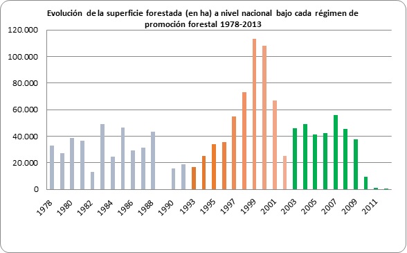 Desde el año 1978 hasta 2011, se promovieron 1.290.455 ha forestales. Esto fue el resultado de la aplicación sucesiva de tres regímenes: Crédito Fiscal (388 108 ha); RPPF (372 347 ha); Ley 25 080 (530 000 ha). El promedio anual (1978 – 2011) fue de 37 931 ha y la superficie máxima fue 113 226 ha en un solo año (1999).