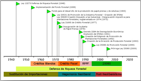 La actividad forestal puede ser señalada como uno de los subsectores agroindustriales que tempranamente y en forma continua ha sido objeto de programas de fomento económico y tecnológico por parte del Estado argentino. Los primeros antecedentes se registran durante la etapa de Sustitución de Importaciones (mediados de Siglo XX) con la formulación de leyes, organismos competentes, asignación de presupuestos específicos e instrumentos de fomento forestal e industrial basados en un sistema de créditos blandos y beneficios impositivos para el sector privado. Estas iniciativas eran justificadas en función de resolver un mercado interno insatisfecho de madera y papel; crear economías generadoras de empleo y divisas; así como la valoración positiva de la dotación de recursos naturales disponibles para la forestación. Dichos elementos que definen la cuestión forestal y legitiman la intervención estatal, se mantienen hasta fines de la década de los 90, momento en el cual se diseña la Ley Nacional 25 080 de Promoción de Bosques Cultivados, actualmente en vigencia.
