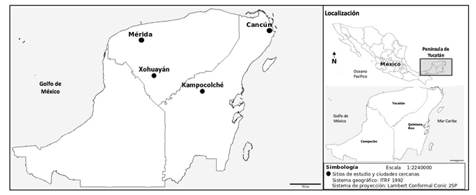 El estudio se realizó en el sureste de México, territorio de indígenas mayas donde se ubican las comunidades de Kampocolché (19º 51’ 08’’ latitud norte, 88º 19’ 50’’ longitud oeste) –en el centro del estado de Quintana Roo– y la comunidad de Xohuayán (20º 11’ 14’’ latitud norte, 89º 22’ 59’’ longitud oeste) en el sur del estado de Yucatán (Figura 1). Estas comunidades se seleccionaron para contrastar diferentes objetivos de producción y estrategias para alcanzarlos.