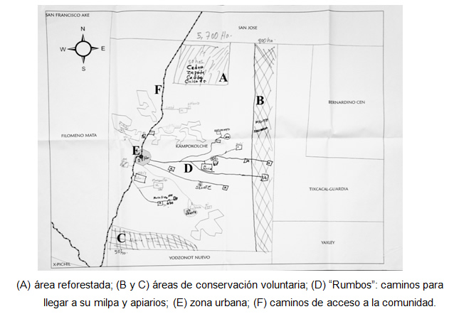 La resistencia en esta comunidad se expresa en la apropiación territorial, en las formas de organización y en los procesos productivos y reproductivos.Un ejemplo de ello se aprecia en la distribución de las milpas y en la organización por rumbos (en la figura 1 las líneas centrales (D) representan los rumbos). En el ejido de Kampocolché la Comisión Nacional para el Conocimiento y Uso de la Biodiversidad (conabio) identificó cuatro áreas de conservación voluntaria (Figura 2), no certificadas y no sujetas a pagos por servicios ambientales2, que en conjunto suman el 11,6% de su superficie (Elizondo y López, 2009). La reserva más antigua tiene una superficie de 220,85 ha y corresponde al “monte de los abuelos” –territorio denominado así por sus habitantes–, el cual se mantiene bajo normas comunitarias de no talar pero se beneficia con la recolecta de herbáceas y de la apicultura.
