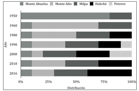 En la figura 3 observamos los cambios en el territorio a lo largo de los años. En 1950 el territorio lo ocupaba principalmente el monte de los abuelos y en menor parte la milpa, pero debido a un incendio, en 1960 el monte alto se redujo drásticamente hasta quedar principalmente monte alto y milpa. Posteriormente reconocen un área de hubché de la cual también se beneficia la cría de abejas. En 1990 los campesinos redujeron el monte alto para dar lugar a potreros con pasto para bovinos. En 10 años esta unidad aumentó, sin embargo, en 2010 la comunidad convino evitar la producción de rumiantes, lo que fomentó la recuperación del monte alto. Para 2016 la mayor parte del territorio la ocupaba la vegetación secundaria, seguida de la milpa y en una menor proporción el monte alto y la reserva (monte de los abuelos).