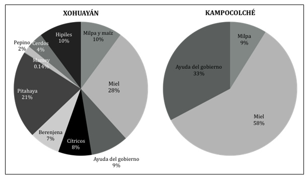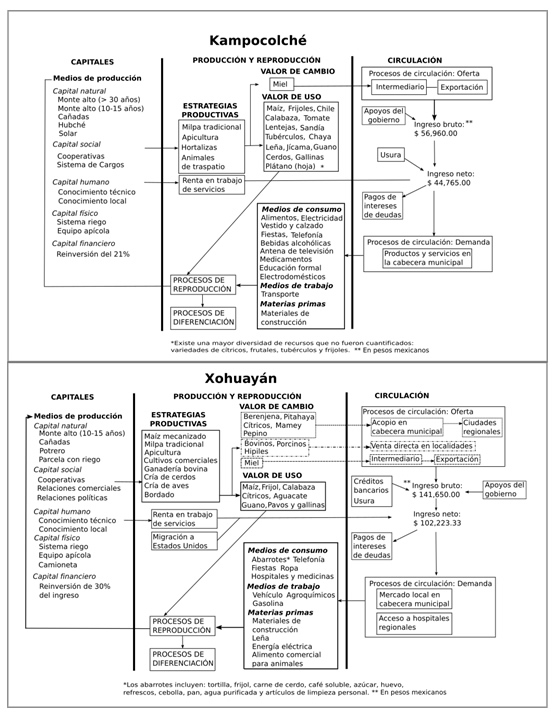 Ambas comunidades han obtenido el capital financiero de la reinversión de la venta de productos al mercado, de programas sociales e intervenciones de diferentes instituciones. En Xohuayán la diversificación permite la obtención de dinero en efectivo a partir de la venta de ganado, la venta de frutas, hortalizas e hipiles –ropas tradicionales de mujer elaboradas por ellas–, y quienes no poseen terrenos con riego venden su mano de obra a quienes poseen ese capital. En Kampocolché, el ingreso monetario proviene de la venta de la miel y de los programas sociales. Los ingresos permiten a estas comunidades acceder a medios de consumo, de trabajo y materias primas para mantener los procesos de reproducción familiar, al mismo tiempo que generan procesos de diferenciación de clase social entre los campesinos, los cuales son más marcados en Xohuayán a raíz del modelo de desarrollo elegido. Si bien los ingresos permiten la satisfacción de necesidades básicas, existen diferencias cualitativas: mientras en Kampocolché tienen acceso a vestido y calzado básico, en Xohuayán acceden a joyas y variedad de zapatos y ropas. Igualmente, mientras en Kampocolché las fiestas se enfocan principalmente en la comida, en Xohuayán adquieren un gusto suntuoso por los adornos y otros bienes complementarios.