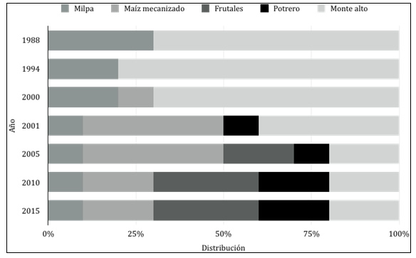 En 1988 los campesinos se dedicaban exclusivamente a la milpa, por lo que el territorio se distribuía 30% milpa y 70% monte alto. Para 1994, con la llegada de la labranza mínima y la consecuente sedentarización de la milpa, el área del monte alto se incrementó. En el año 2000 la tendencia de reducción continuó para dar paso al maíz mecanizado, el cual siguió aumentando a costa del monte alto y la milpa tradicional. En 2001 los campesinos incorporaron los potreros, que continuaron su expansión.De la misma manera, la unidad de riego para frutales y hortalizas aparece en 2005 y aumenta de tal forma que en 2015 es la unidad territorial más amplia (Figura 5).
