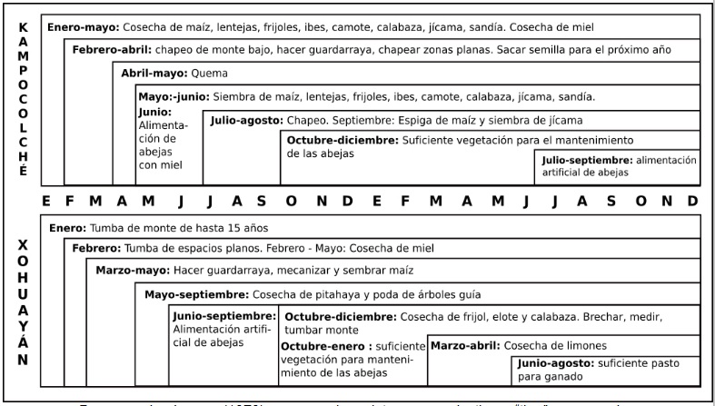 Para adaptarse a las demandas del mercado los campesinos en Xohuayán han modificado las prácticas productivas tradicionales, mientras que en Kampocolché perpetúan estas últimas. Ello se refleja en las actividades que realizan durante el año y que representamos en sus calendarios agrícolas (Figura 6).