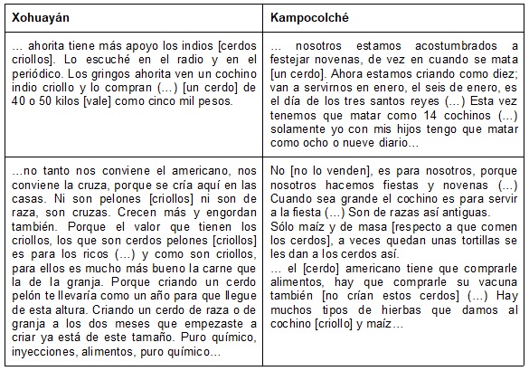 La valoración de la raza de estos animales es diferente en cada uno de los sitios de estudio.Mientras en Xohuayán se busca capitalizar su producción, en Kampocolché le asignan una función de ofrenda en las ceremonias religiosas y tratan que les cueste lo menos posible su mantenimiento (Tabla 1). Igualmente importante es el cambio en la apreciación que tienen de la raza criolla, pues en Xohuayán su valoración no es intrínseca de la conservación de la raza propia de la región, sino que queda subordinada al beneficio que otra clase social pague por él.