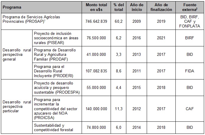 De los siete programas en vigencia el PROSAP concentra poco más del 60% de los fondos en ejecución y el 84% de los ejecutados. Cuenta con una amplia cartera de servicios, entre los que se destaca el financiamiento de obras de infraestructura para zonas rurales, y tiene una articulación consolidada con los gobiernos provinciales por ser éstos contraparte para la obtención de los préstamos internacionales. El primer empréstito data de 1996, este hito puede considerarse el inicio de lo que luego constituiría la UCAR. De los seis programas restantes: i) tres están orientados a sectores productivos específicos (acuícola, forestal y cañero) y representan casi el 22% de los fondos; ii) los otros tres presentan un abordaje general del desarrollo rural y dos de ellos hacen referencia explícita a la inclusión en su denominación (PISEAR y PRODERI).