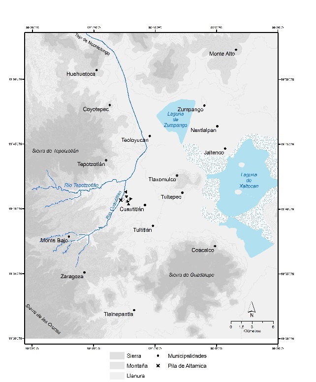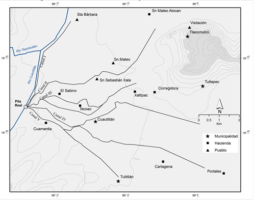 Las ricas y extensas coberturas forestales, en lo alto de la Sierra de las Cruces, proveían de vastos manantiales y escurrimientos naturales a la región (Venegas, 1923). Uno de estos escurrimientos era el río Cuautitlán, el cual recogía la mayor parte de las aguas de la serranía3 para después dirigirse al noreste por las montañas y las tierras del distrito de Tlalnepantla y Cuautitlán; al llegar a la planicie del valle parte de sus aguas eran derivadas a la Pila Real de Atlamica para fertilizar las tierras de las haciendas, los ranchos y los pueblos.4 El río continuaba su curso hacia Teoloyucan donde recibía las aguas del río Tepotzotlán, para finalmente dirigirse hacia el tajo de Nochistongo y el río Tula (Morlán, 2012, pp. 24-26).