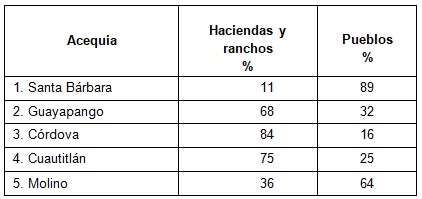 En general, las haciendas y los ranchos obtuvieron en el reparto el 57.5 % del agua y los pueblos el 42.5 %. Así, se podría decir que la distribución fue equitativa; pero si vemos la distribución del agua por acequia, notamos que el reparto fue bastante desigual como se puede ver en la siguiente tabla.
