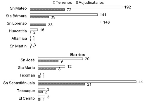 La gráfica nos muestra que San Mateo y Santa Bárbara fueron los pueblos en donde hubo más parcelas de común repartimiento desamortizadas; no obstante, en otros pueblos también se adjudicaron varias tierras como en San Lorenzo y San Sebastián. El considerable número de parcelas desamortizadas en manos de una sola persona comprueba que antes de 1856 ya existía la compraventa de tierras; incluso, comerciantes extranjeros como José Pico Cerro compraron tierras dentro del sistema de riego.
