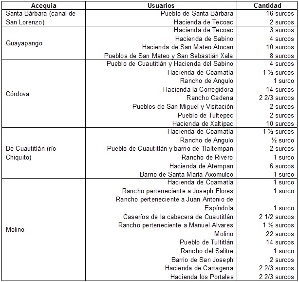 Por una parte, las haciendas y los ranchos ubicados en las acequias de Guayapango, Córdova y Cuautitlán obtuvieron mayores volúmenes de agua (véanse tabla 1 y 2); ello hace pensar que en esta parte del sistema de riego las haciendas habían acaparado parte de las tierras de los pueblos. Por otra parte, los pueblos que mejor resultaron beneficiados en el reparto fueron los de Teoloyucan, Santa Bárbara, San Mateo, San Sebastián Xala, San Lorenzo y Santa María Huacatitla. El primer pueblo recibió 15 surcos de agua a través de la cuneta de “Teoloyucan”, en tanto que los pueblos restantes recibieron 16 surcos de agua a través del primer canal llamado “Santa Bárbara”. Los pueblos de San Mateo y San Sebastián Xala recibieron ocho surcos más a través del segundo canal nombrado “Guayapango” (véanse tabla 1 y 2). El hecho de que los pueblos ubicados en las acequias de Santa Bárbara y Guayapango hayan recibido más agua implica que las tierras de común repartimiento aún estaban en su poder, pero este panorama cambió con la expedición de la ley del 25 de junio de 1856.
