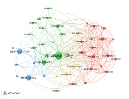 Para comprobar la forma en que estaban interrelacionadas estas palabras claves procedimos a crear otra red de co-ocurrencias. En la Figura 2 del Anexo podemos ver las agrupaciones obtenidas. La primera gira en torno al nodo “agricultural history” (color verde). En este clúster se conectan temáticas de tipo económico (agricultura, tierra, economía, crecimiento, gestión, sistemas de producción) o socioeconómico (“farmers”, mujeres, desigualdad). Ligado a este clúster y a las temáticas más sociales hay otro más secundario (color azul), en torno a las palabras “rural history” y “agrarian history”, en el que resalta el término “historiografía”, lo que denota el interés teórico y metodológico que suscitan estos campos, en especial en España, que brilla con luz propia. Porque sería injusto considerar que la historia agraria no ha evolucionado y se ha quedado completamente estancada. Sobre todo, en relación con la perspectiva sostenible, tanto desde el punto de vista ambiental como social, así como en los análisis institucionales (González de Molina, 2012; Iriarte Goñi, 2013).